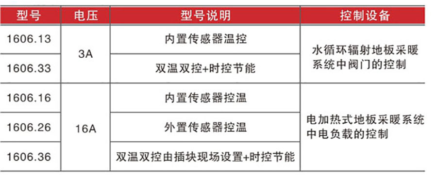 系列國際通用型采暖電子溫控器,采用直接墻面安裝,溫度范圍5- 40C。LED指示燈亮?xí)r表示正在加熱。適用于采暖(設(shè)備)系統(tǒng)的溫度自動(dòng)調(diào)節(jié)控制。具備雙溫度傳感技術(shù),為舒適、安全、節(jié)能的高標(biāo)準(zhǔn)要求。