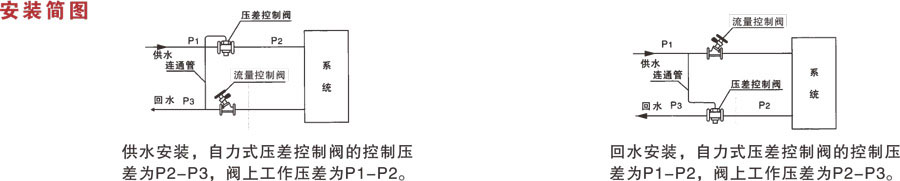 按閥體上箭頭所示的水流方向安裝,DN32- 125的要安裝在回水管道上,在供水管道上將連通管的安裝接頭裝好,并確認其內(nèi)孔與供水管相通(安裝接頭為1/4管螺紋),然后裝上連通管,連通管的另一頭與閥門上的控制孔相連,DN15- -25的要裝在供水管道上,連通管與回水相通。如下圖所示。