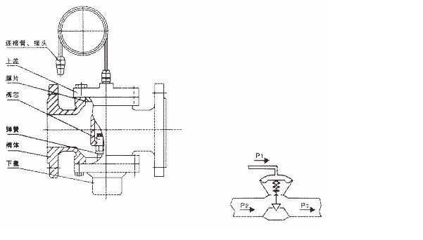 現(xiàn)以安裝在回水管道上的ZYC型自力式壓差控制閥為例說明工作原理。當供水壓力P1增大或減不時,信號由連接管傳入膜片上腔,帶動閥芯下移或上移,使閥座的流通面積減小或增大。P2 - P3也增大或減小,直到P1-P2保持原值恒定。當回水壓力P3增大或減小的:瞬間同閥座流向出口的流速降低或升高,膜片下壓力P2也在這個瞬間增高或降低,帶動閥芯上移或下移,直到膜片的受力重新平衡,P2恢復原值,P1-P2保護原值恒定,從而保證了被控系統(tǒng)的供回水間壓差基本不變